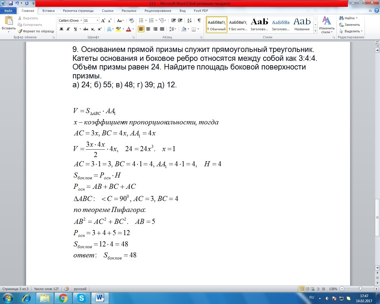 9. Основанием прямой призмы служит прямоугольный треугольник. Катеты основания и боковое ребро относятся между собой как 3:4:4. Объём призмы равен 24. Найдите площадь боковой поверхности призмы.