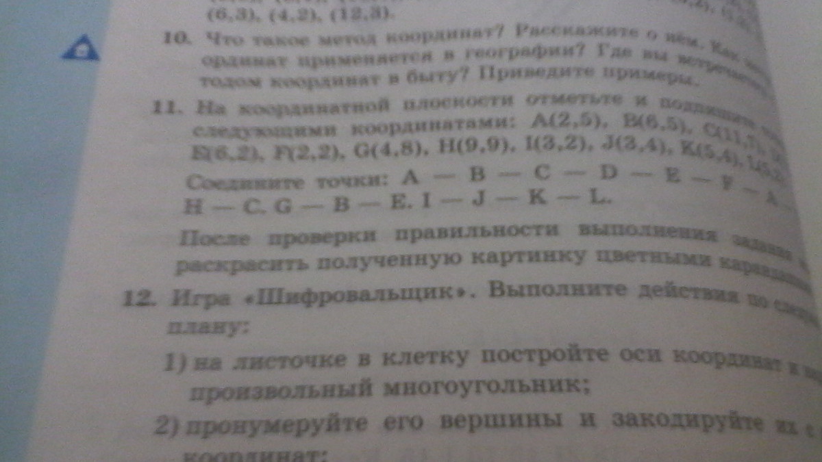 информатика отметить на координатной плоскости точки со следующими координатами:A(2,5),B(6,5),C(11,7),D(11,4),E(6,2),F(2,2),G(4,8),H(9,9),I(3,2),J(3,4),K(5,4),L(5,2).Соедините точки:A-B-C-D-E-F-A-G-H-C.G-B-E.I-J-K-L. номер:11