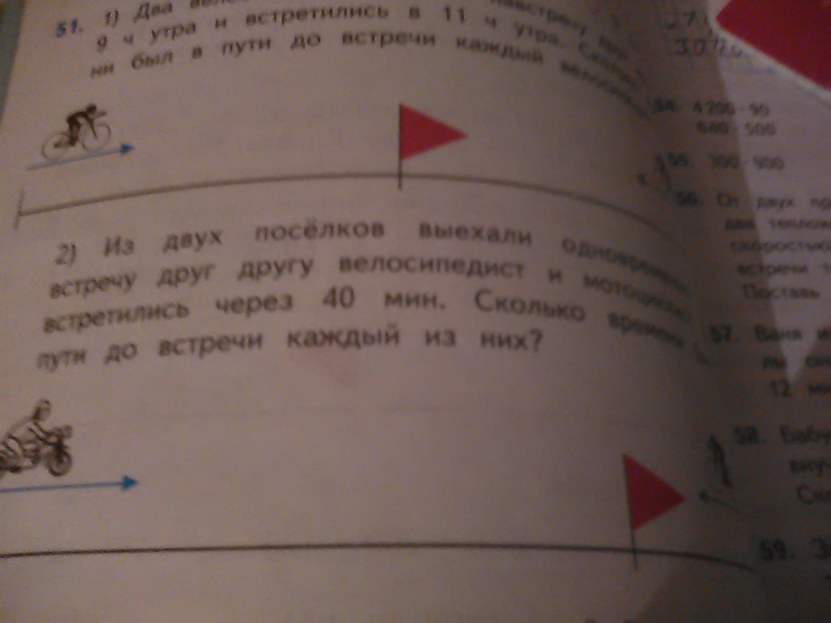 из двух посёлок выехали одновременно навстречу друг друга велосипедеист и мотоцфкль.они встретились через 40мин . сколько времени был в пути до встречи каждый из них