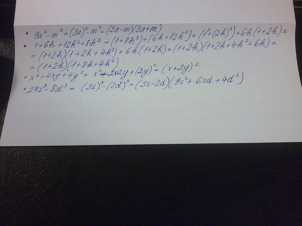 разложите на множители, применяя формулы сокращенного умножения 9a^2 - m^2,1 + 6h + 12h^2 + 8h^3, x2 + 4xy + 4y^2, 27s^3 - 8d^3