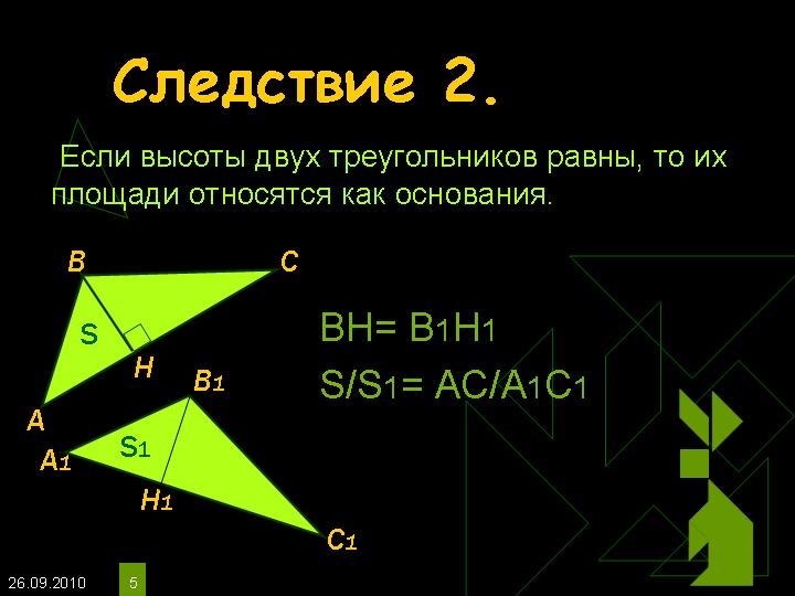 СЛЕДСТВИЕ 2: ЕСЛИ ВЫСОТЫ 2-Х ТЕРУГОЛЬКОВ РАВНЫ,ТО ИХ ПЛОЩАДИ ОТНОСЯТСЯ КАК ОСНОВАНИЯ!