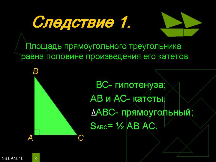 Следствие 1: площадь прямоуг. треугольников равна половине произведения его катетов