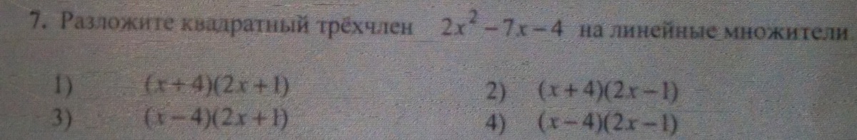 2x^2-7x-4=2(x-x_1)(x-x_2),\\2x^2-7x-4=0,\D=(-7)^2-4bullet2bullet(-4)=49+32=81,\\x_1=frac{7+sqrt{81}}{2bullet2}=frac{7+9}{4}=4,  x_2=frac{7-9}{4}=-frac{1}{2}.\\2x^2-7x-4=2(x-4)(x+frac{1}{2}).