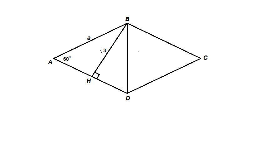 В ромбе один из углов равен 60 градусов . Высота ромба равна √3 . Найдите длину меньшей диагонали .
