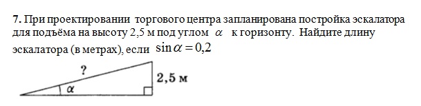 При проектировании торгового центра запланирована постройка эскалатора для подъёма на высоту 2,5 м под углом a к горизонту. Найдите длину эскалатора (в метрах), если sin a = 0,2