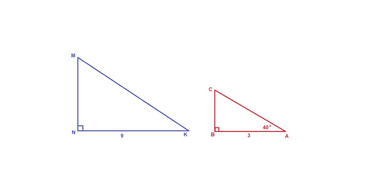 В прямоугольном треугольнике ABC угол A = 40 градусам , угол B = 90 градусам , а в треугольнике MNK углы M, N, K относятся как 5 : 9 : 4 . AB = 3 см , KN = 9 см . Найдите : а) ВС : NM; б) S треугольника ABC : S треугольника MNK ; в ) P abc : P mnk