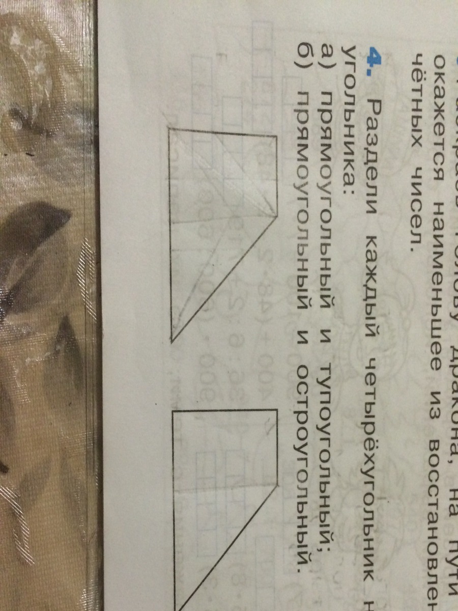 раздели каждый четырёхугольник на два треугольника. а) прямоугольный и тупоугольный б) прямоугольный и остроугольный