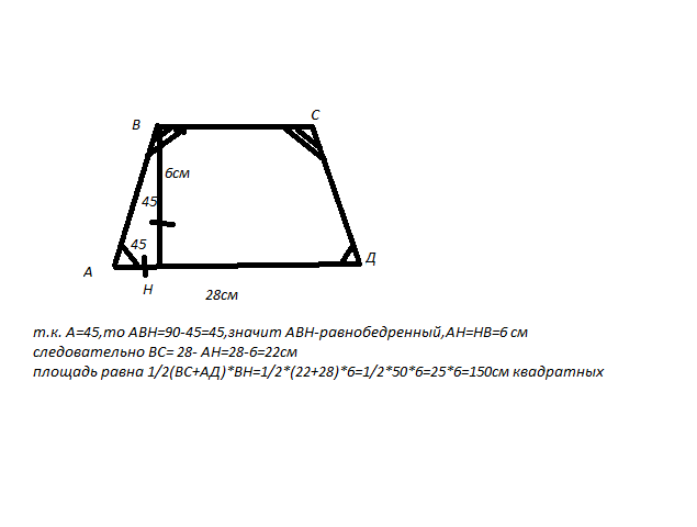 2) Найдите площадь равнобедренной трапеции, если ее большее основание равно 28 см, высота - 6 см, и острый угол 45 градусов.