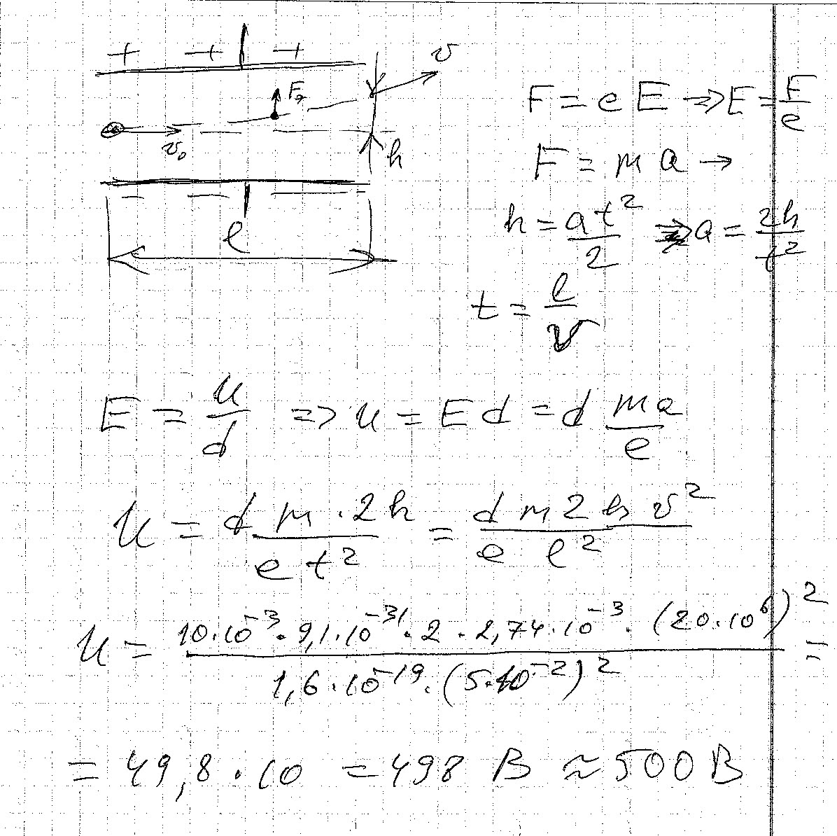1.6 Электрон влетает в плоский конденсатор параллельно пластинам со скоростью V. Расстояние между платинами конденсатора d, длина пластин l. На пластины подано постоянное напряжение U. К моменту вылета из конденсатора электрон смещается от начального направления на расстояние h под действием силы напряжения. Найти неизвестные величины: