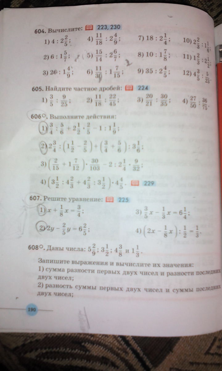 606 пример 1действие 3|4: 5|6=3|4*6|5=3|2*3|5=9|7=1 2|7 2 действие 2 1|2*2|5=2|5*2|5=1|1*1|1=1 3 действие 1:1 1|9=9|9*9|10=9|10 4 действие 1 2|7+1=2 2|7 5 действие 2 2|7-9|10=2(2|7) (то что вскобках умножаем на 10) - (9|10) (то что в скобках умножаем на 7) = 2 20|70-63|70=1 90|70-63|70= 1 27|70