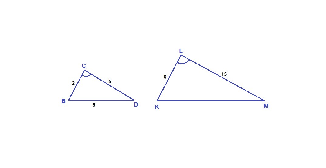 В треугольниках bcd и klm известны стороны: bc=2, cd=5, bd=6, kl=6,lm =15 .найдите длину mk если угол l= Углу C