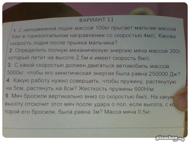 5. В момент бросания мяч обладал энергией равной Еполн.= Екинет + Е потенц = m(V²/2 + gh). После отскока на максимальной высоте подъема кинетическая энергия мяча равна нулю, т.к. в высшей точке его скорость равна нулю. Следовательно, мяч будет иметь лишь потенциальную энергию Еп = mgH. Поскольку в задаче ни чего не говорится об упругости удара мяча о пол, и о сопротивлении воздуха, будем считать, что сопротивление воздуха отсутствует, и что удар абсолютно упругий. В этом случае вся энергия, которую имел мяч в момент бросания перейдет в потенциальную энергию на максимальной высоте подскока. Тогда запишем уравнение: m(V²/2+ gh) = mgH. Или (V²/2+ gh) = gH. Отсюда H = (V²/2+ gh)/g = (6²/2 + 10*3)/10 = 4,8 м.