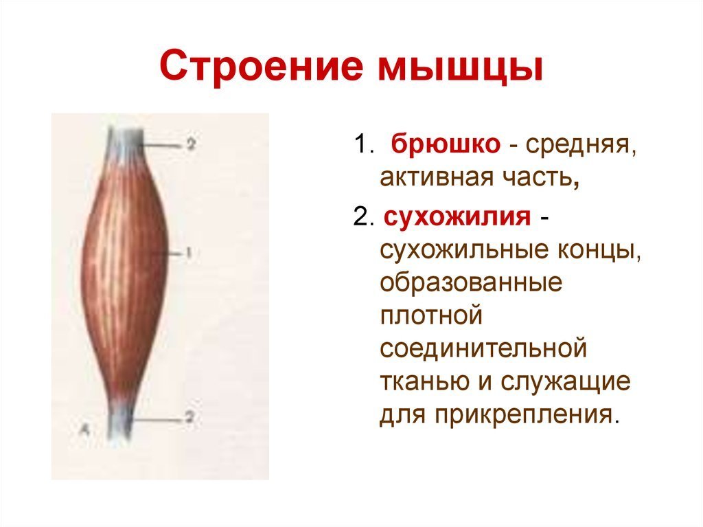 Связь мышц и и костей скелета осуществляют сухожилия. Каждая мышца заключена в оболочку из соединительной ткани как в плотный чулок. Эта соединительнотканная капсула на концах мышцы образует плотные тяжи - сухожилия, которыми мышца крепится к костям.