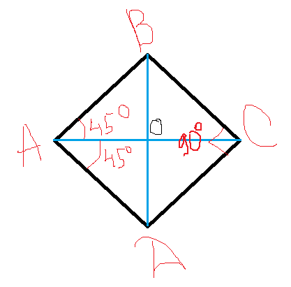 угол между диагональю и стороной-угол ВАС. т к треугольник ВАД равнобедренный, то диагональ АС-бессиктриса угла А, значит углы ВАС и ДАС равны, значит угол ВАД равен 2*45=90 град, т к сумма углов ВАД и АВС равна 180, отсюда следует, что угол АВС равен 180- 90 = 90 град.противоположные углы в ромбе равны( угол А= углу С, угол В = углу Д) ромб, в котором все углы прямые является квадратом.что и требовалось доказать