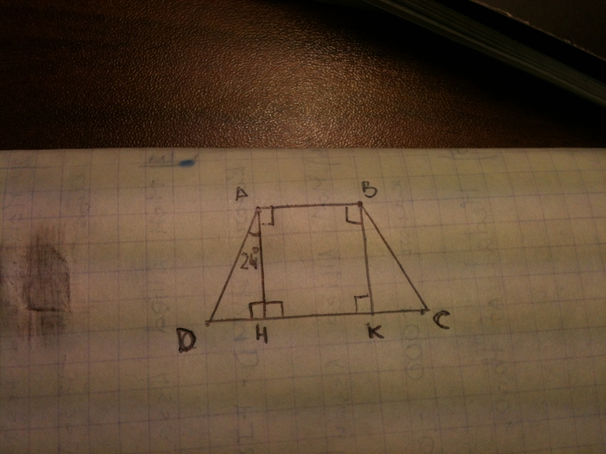 Так как угол А в треугольнике ADH =24гр., то угол А в трапеции ABDC=24+90=114гр.