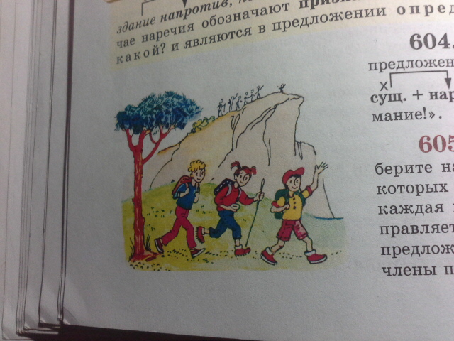 рассмотрите рисунок. подберите наречия-антонимы, с помощью которых можно пояснить где находится каждая группа туристов, куда она направляется. с этими словами составьте предложения. подчеркните наречия как члены предложения.