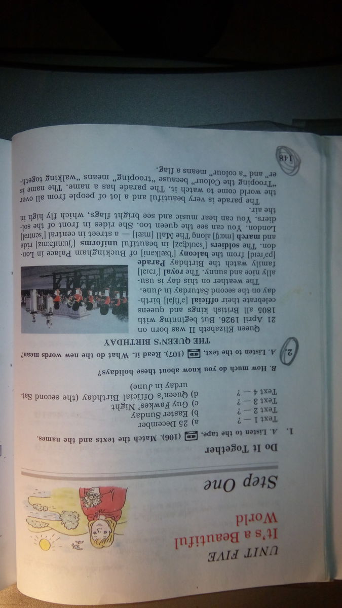Королева Елизавета Вторая родилась 21 апреля 1926 года. Но с началом 1805 года все Британские короли и королевы праздновали свои официальные дни рождения в день второй субботы Июня. Погода в этот день обычно хорошая и солнечная. Королевская семья смотрит Парад в честь дня рождения с балкона Букингемского дворца в Лондоне. Солдаты в красивых униформах идут и маршируют по всему Моллу - улице в центре Лондона. Вы можете видеть королеву тоже. Она едет впереди солдат. Вы можете слышать музыку и видеть яркие флаги, которые парят высоко в небе. Парад очень красив, и много людей со всего мира приезжают, чтобы увидеть это. Парад имеет своё название. Это название - "Вынос знамени", потому что "Trooping" означает "идти вместе", а "Banner" означает "знамя".