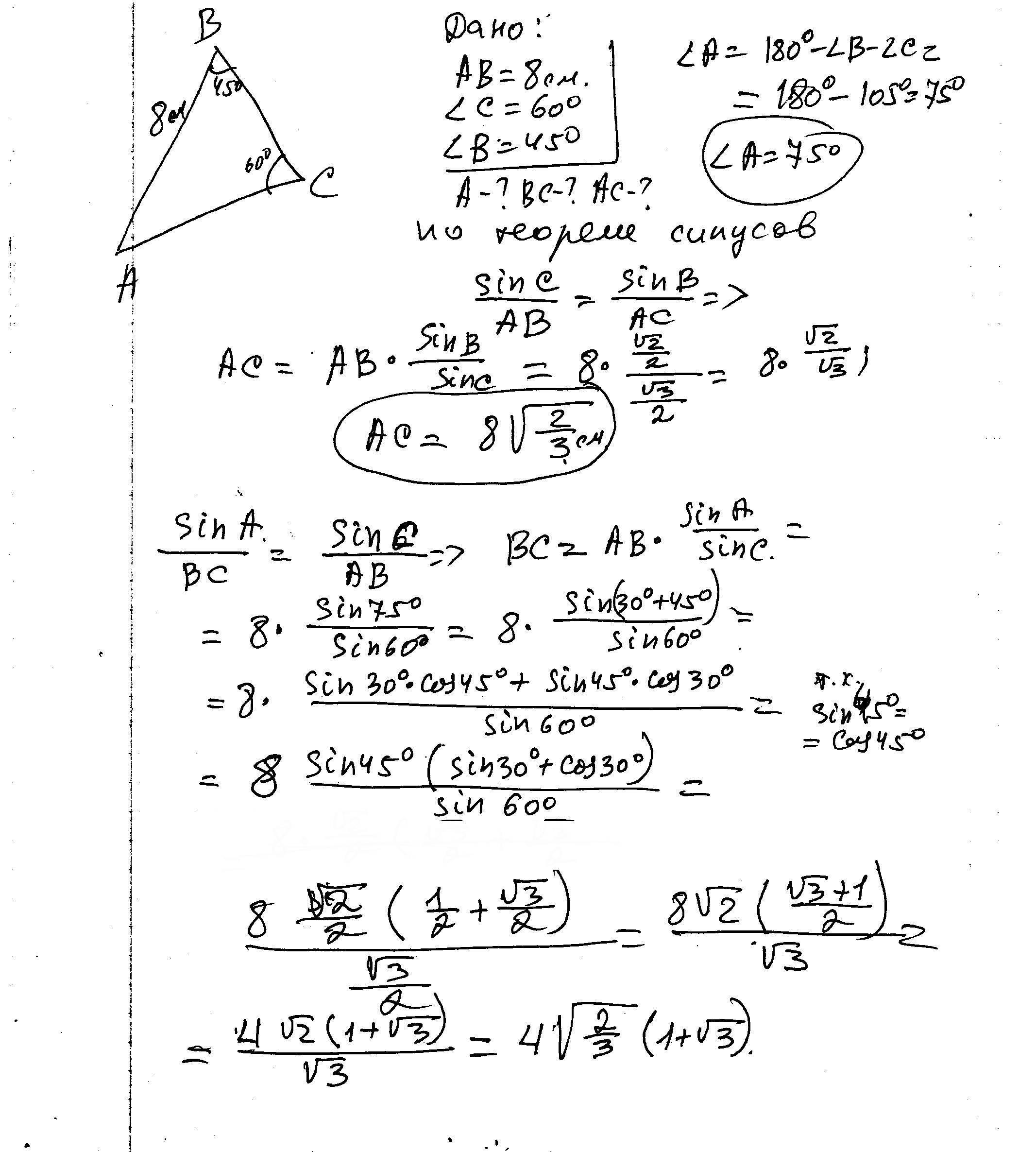 Используя теорему синусов,решите треугольник ABC,если:AB=8см,угол B=45градусов,угол С=60градусов