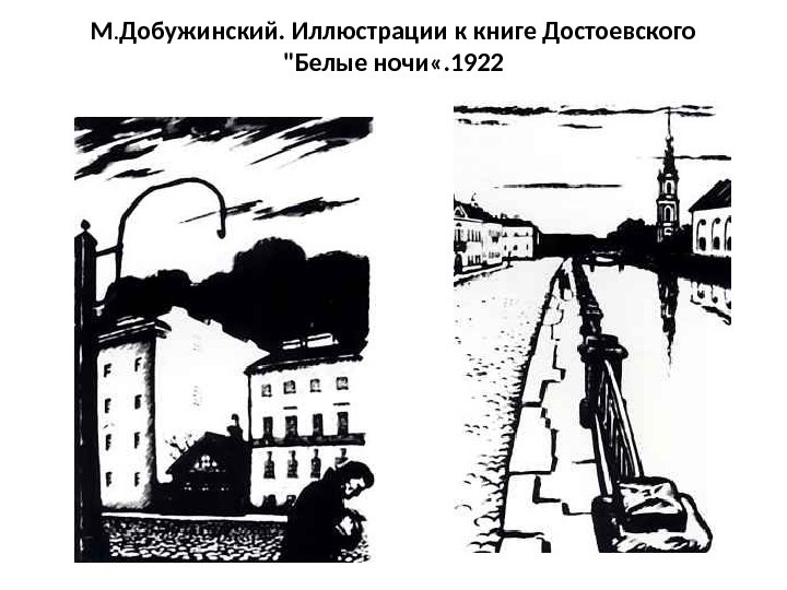 Иллюстрации М. Добужинского очень тонко отражают настроение "Белых ночей" ,художник использует чёрно-белые цвета.Именно поиск белого-радостного,светлого чувства в чёрном,холодном и неприветливом мире Петербурга,но до боли любимом художником городе.Чёно-белые тона -это настроение героев,нет середины ,переходных цветов,весь трагизм романа вырисовывается в черно-белом цвете,противопоставлении белых ночей.