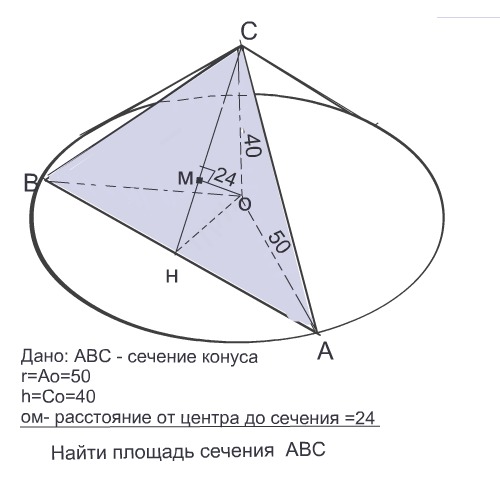 найдите площадь сечения конуса плоскостью, учитывая, что она проведена через вершину конуса и от центра основания на 24 см, высота конуса равна 40 см, а радиус основания-50см