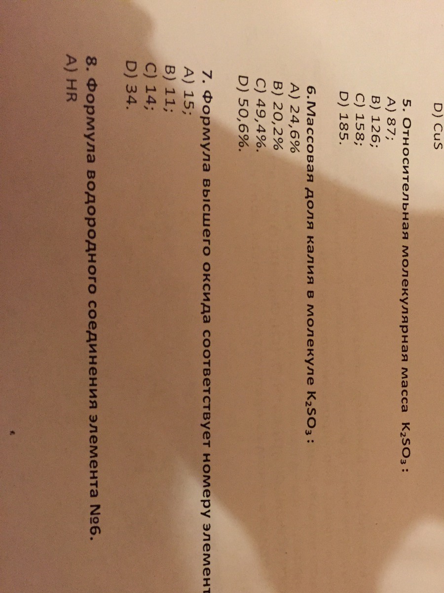 7. Если вопрос такой: Формула высшего оксида соответствует номеру элемента R2O5 (я не вижу на картинке, там не полное фото), то ответ: А) 15