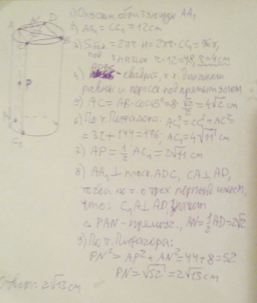 В цилиндре, длина высоты которого равна 12 см, а площадь боковой поверхности 96π см2, проведены два взаимно перпендикулярных диаметра основания АВ и СD и образующая СС1. Точка N - середина отрезка АД. точка Р - серtдина отрезка АС1. Вычислите длину отрезка NP