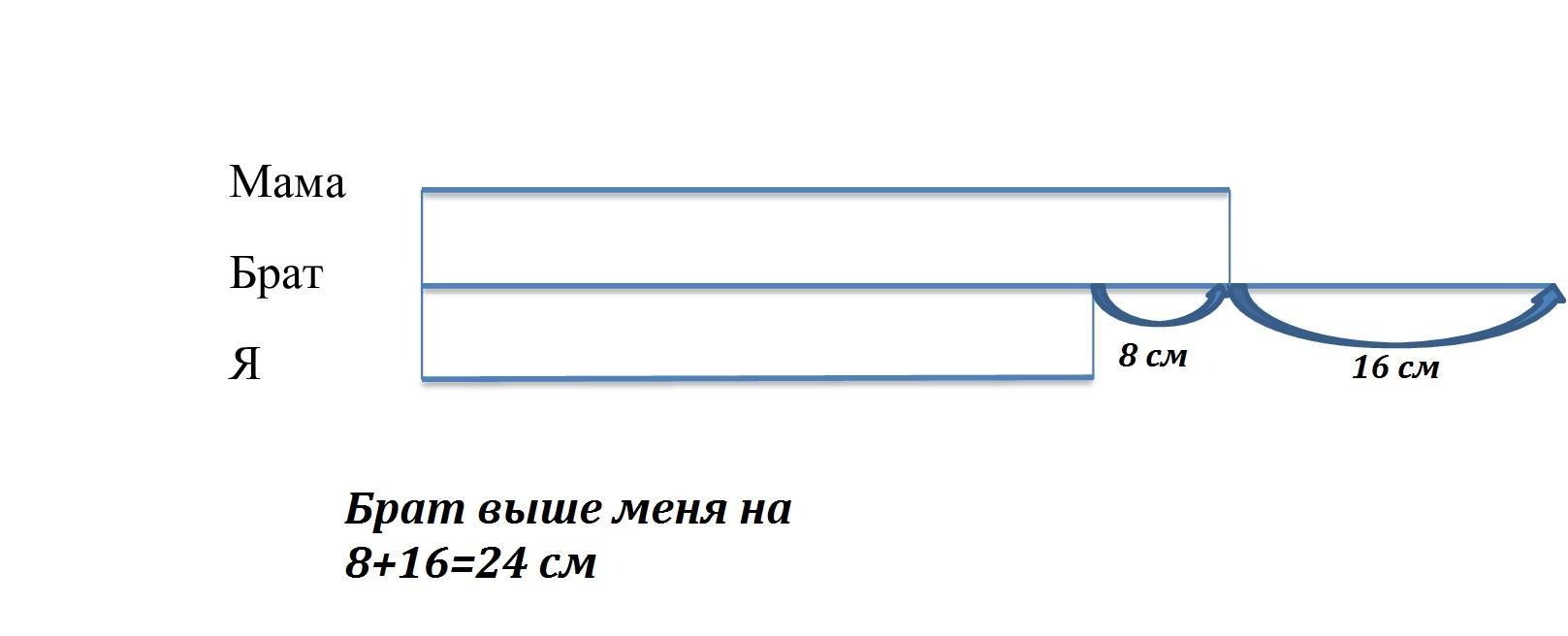 У моей мамы рост 164 см. Мой брат на 16 см выше мамы, а я пока на 8 см ниже мамы.Какой у меня рост?Сделай схиматический чертеж к задаче и определи на сколько сантиметров брат выше меня