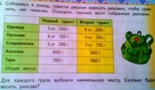 Собираясь в поход ,туристы решили взвесить рюкзаки,чтобы сравнить ,чей тяжелее.Определи ,сколько весят собранные рюкзаки?