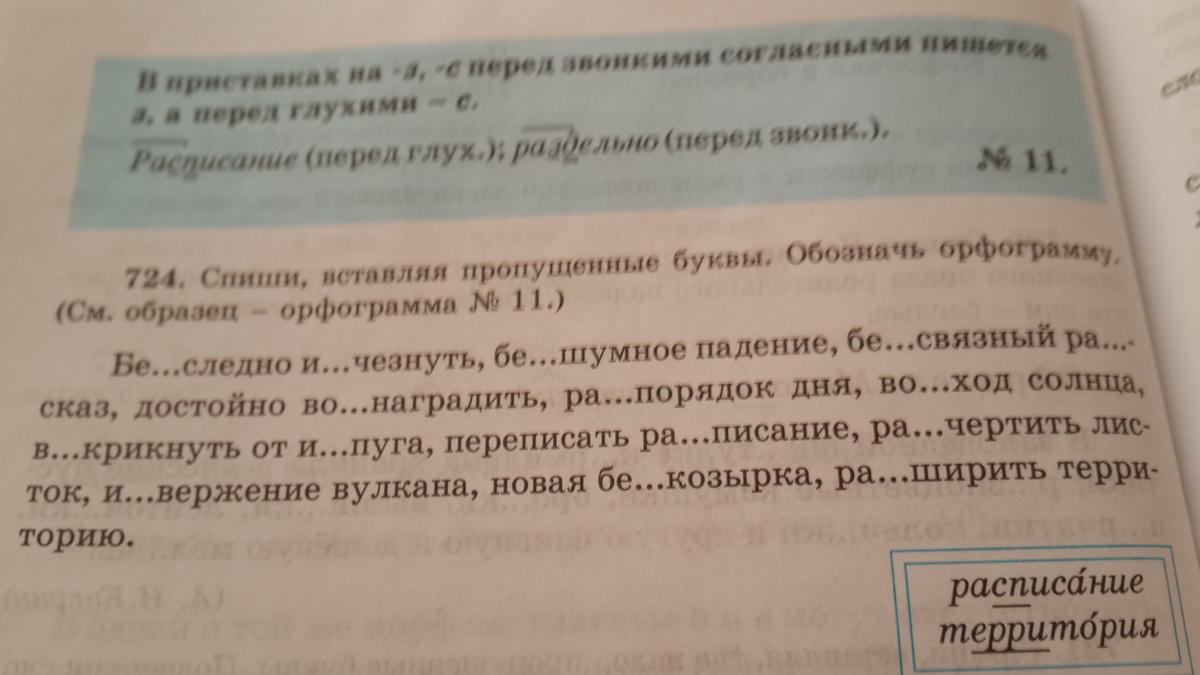Бесследно, исчезнуть, бесшумное падение, бессвязный рассказ, достойно вознаградить, распорядок дня, восход солнца, вскрикнуть от испуга, переписать расписание, расчертить листок, извержение вулкана, новая бескозырка, расширить территорию.