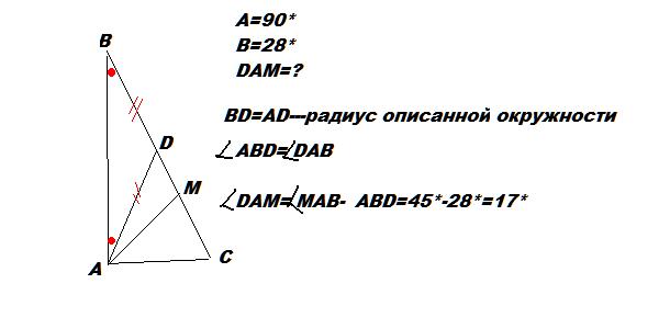Найдите угол между биссектрисой AM и медианой AD прямоугольного треугольника с прямым углом A и углом B=28 градусов
