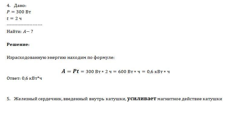 4. Какую энергию из расходует электрический утюг мощностью 300 Вт за 2 часа работы?