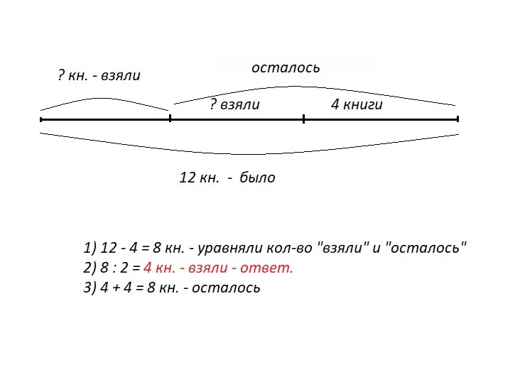 Рассуждай так: Если бы оставшихся книг не было на 4 больше, то тогда было бы одинаковое количество книг, которые взяли и которые остались, а всего их было бы 8, потому что: 12 - 4 = 8 (к.)