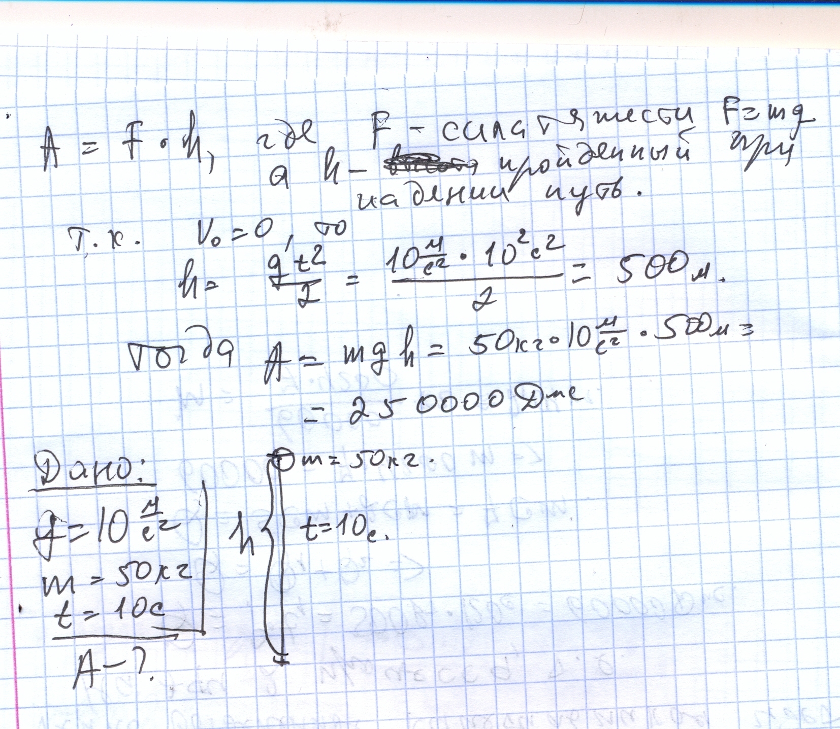 Груз массой 50 кг свободно падает из состояния покоя в течение 10с. Какую работу совершает сила тяжести за этот промежуток времени?