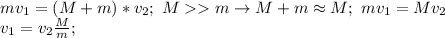 Запишем закон сохранения импульса при ударе пули массой m в мешок массой М. (1 фото)