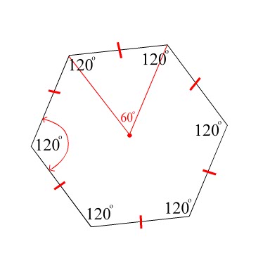 Раз шестиугольник правильный, то все углы равны ⇒ каждый угол равен 720/6=120