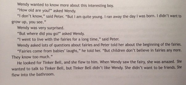 "Я не знаю", сказал Питер. "Но я достаточно молод. Я сбежал (?). Я не хотел взрослеть, как видишь".