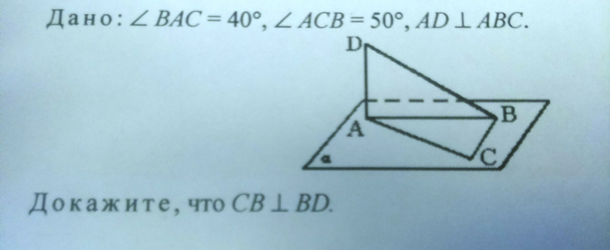 Угол ABC равен 180-40-50=90, т.е. CB перпендикулярна проекции AB наклонной BD. Тогда по теореме о 3-х перпендикулярах, сама наклонная BD тоже перпендикулярна CB.