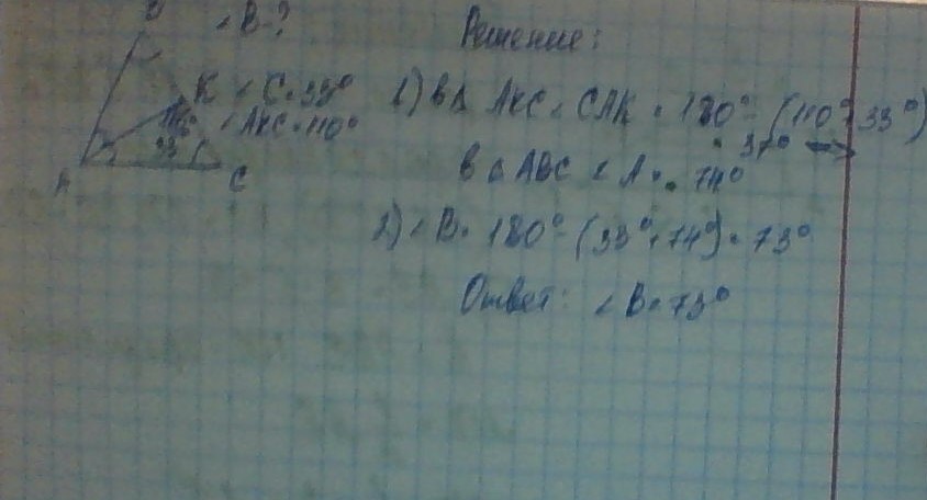 В треугольнике АВС проведена биссектриса АК. Найдите угол В, если угол С равен 33 градуса, а угол АКС равен 110 градусов.