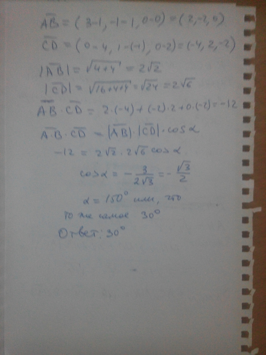 Найдите угол между прямыми АВ и CD,если А(1;1;0), В(3;-1;0), С(4;-1;2) и D(0;1;0)