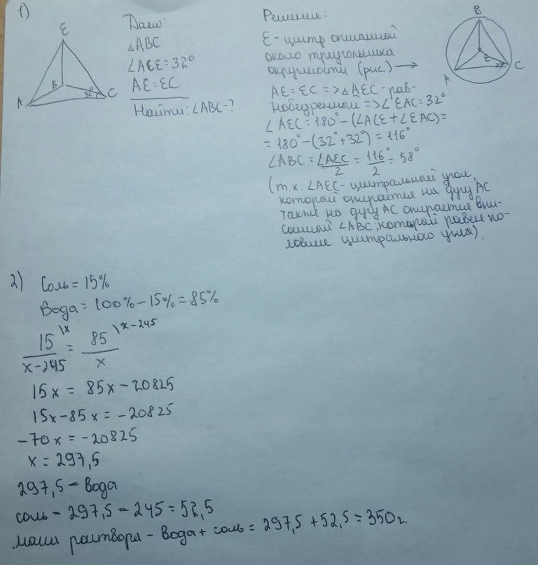 Точка Е равноудалена от вершин треугольника АВС и находится в плоскости данного треугольника АСЕ=32 градуса.Найдите угол АВС