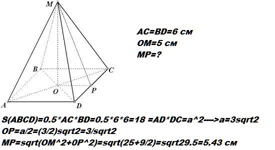 Диагональ квадрата равна 6 см.Точка,равноудаленная от всех вершин квадрата,находится на расстоянии 5см от точки пересечения его диагоналей.Найдите расстояние от этой точки до стороны квадрата.