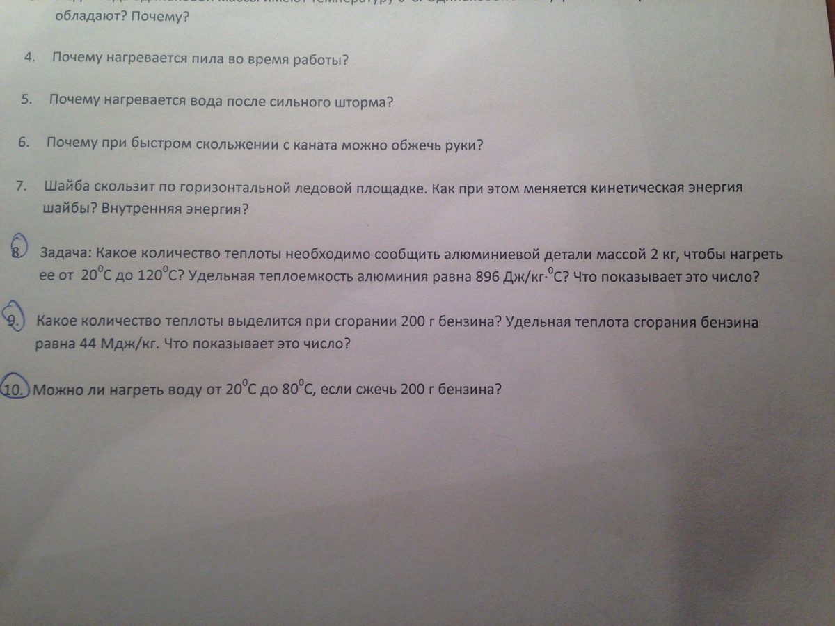 10)m2=0,2 кг,q=44*10^6 Дж/кг с=4200 Дж /кгС,, to=20C,t=80C. m1-? Q1=cm1(t-to) надо для нагрева воды, Q2=qm2 выделяется при сгорании бензина. Уравнение теплового баланса: Q1=Q2; cm1(t-t0) =qm2; m1=qm2/c(t-to) =44*10^6*0,2/4200(80-20)=8,8*10^6/(42*6)*10^3=34,92 кг. Можно нагреть 34 кг 920г воды.
