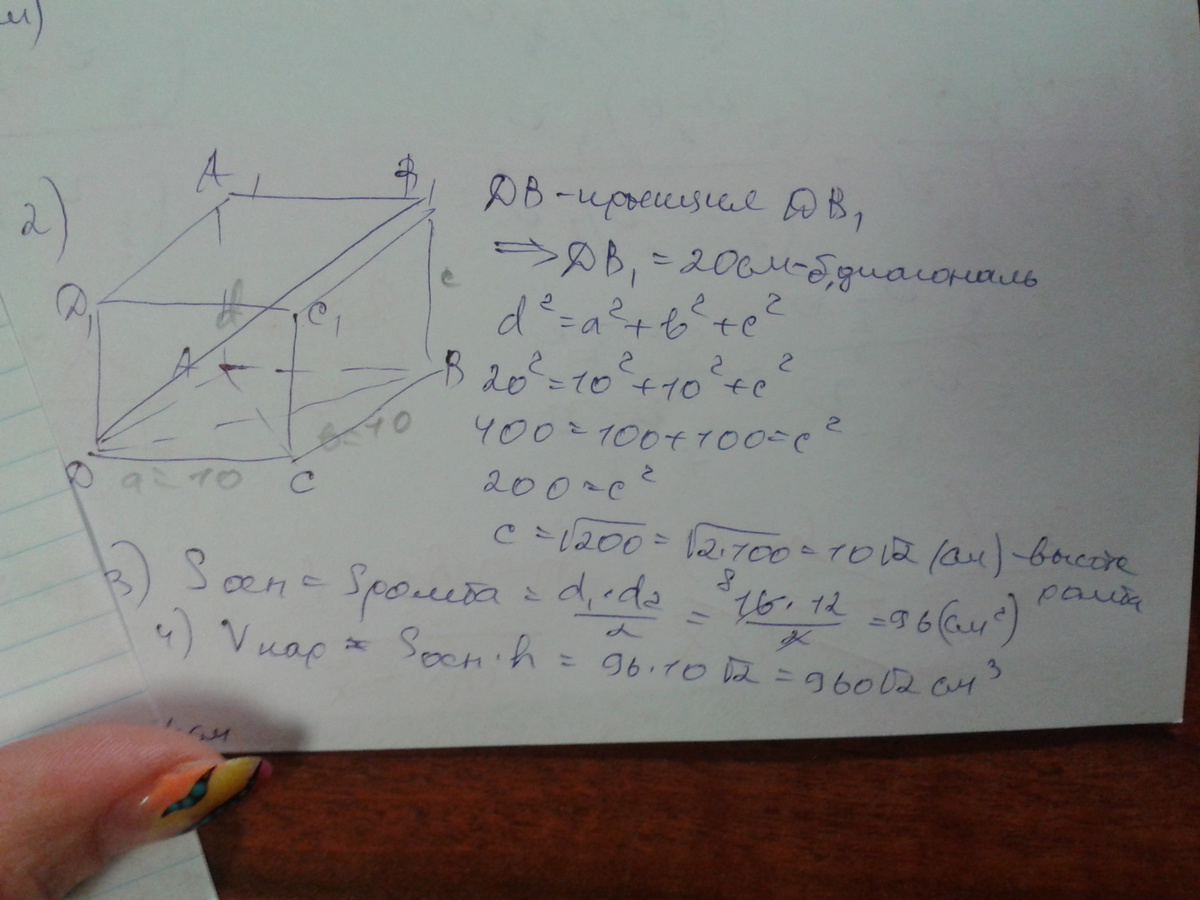 Основанием прямого параллелепипеда ромб с периметром 40 см. Одна из диагоналей ромба равна 12 см. Найдите объем параллелепипеда, если его большая диагональ равна 20 см.