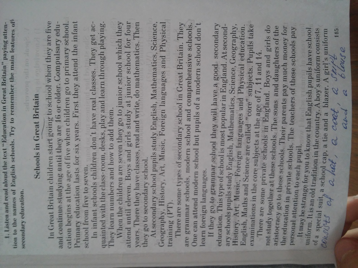 В Великобритании дети начинают ходить в школу ,когда им пять лет и продолжают пока им не исполнится 16 или больше лет.Обязательное образование начинается в возрасте от 5 лет,когда ребенок ходит в начальную школу.Начальное образование продолжается в течении 6 лет.В первые они посещают детскую школу от 5 до 7 лет.В детской школе у детей нет обычных классов.Они знакомятся с классом,партой,играют и учатся играя.Они учат числа и как прибавлять их.Когда детям исполняется 7 лет они в юношескую школу,в которую ходят пока им не исполнится 11 лет.Мальчики и девочки учатся в юношеской школе в течении 4 лет.там у них классы,чтение и письмо,выполнение математики.Затем они идут в общеобразовательную школу.В общеобразовательной школе учат математику,английский,науку,географию,историю,искусство,музыку,иностранные языки и физкультура.Там несколько видов общеобразовательной школы.Гимназия,современная школа,общеобразовательная школу.Ученик может посещать современную школу ,но ученики современной школы не изучают иностранные языки.Если они идут в гимназию,то они будут иметь хорошее среднее образование.Этот тип школ популярен в Англии.Ученики средних школ изучают английский,математику.науку,географию,искусство,рисование,музыку,иностранные языки и физкультура.Английский,математика и наука называются основными предметами.Ученики сдают экзамены по основным предметам в возрасте от 7.11 до 14 лет.В Англии есть несколько частных школ.Мальчики и девочки в этих школах не учатся вместе.В эти школы ходят сыновья и дочери аристократов.Их родители платят очень много денег на образование в частной школе.Учителям в этих школах платят за персональное внимание каждому ученику.Это может быть странно для вас,что английские ученики носят униформу.Это старая традиция страны.Униформа мальчика состоит из специального костюма,школьной шляпы, галстука и пиджака.Девичья униформа состоит из шляпы,пальто,юбки и блузки.
