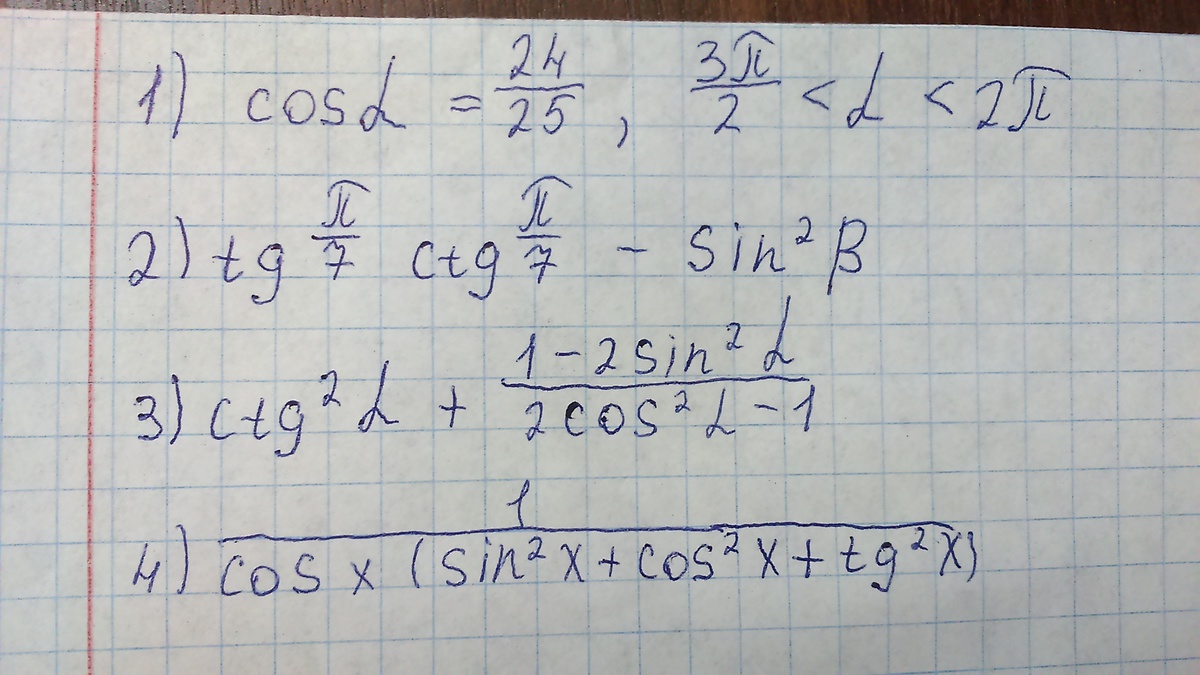 2. tg(π/7)*ctg(π/7)-sin²B=1-sin²B=cos²B