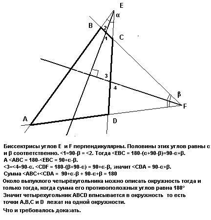 Биссектрисы двух углов перпендикулярны,а их стороны пересекаются в четырех различных точках.Докажите,что эти точки лежат на одной окружности.