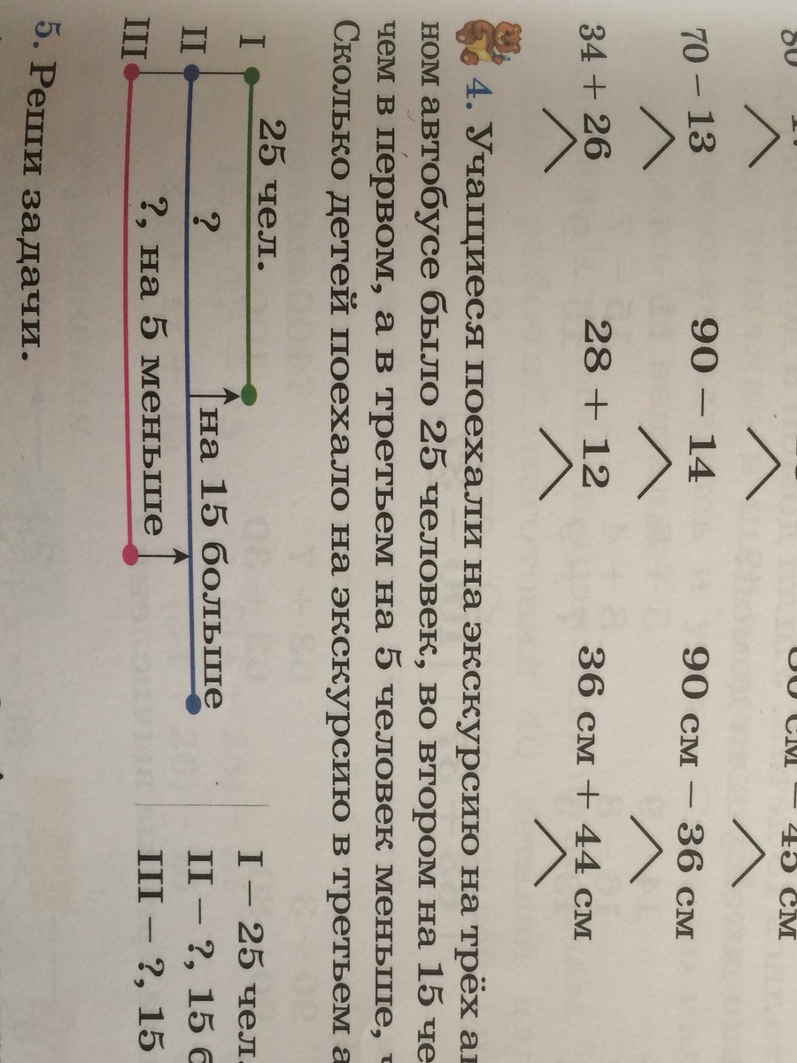 Задача. Учащиеся поехала на экскурсию на трех автобусах. В одном автобусе было 25 человек , во втором на 15 человек больше, чем в первом, а в третьем на 5 человек меньше , чем во втором. Сколько детей поехало на экскурсию в третьем автобусе