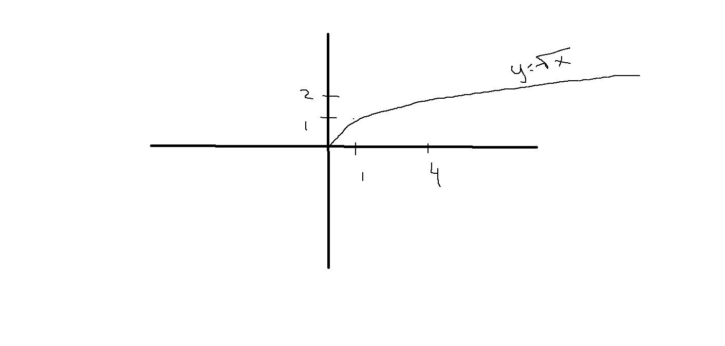 Теперь посмортим на его свойства, это прямая, проходящяя через начало координат, точка(0;0) (уже 1 точка) и через точку (4;2) черет эту же точку проходит и наш график y=sqrt(x)
