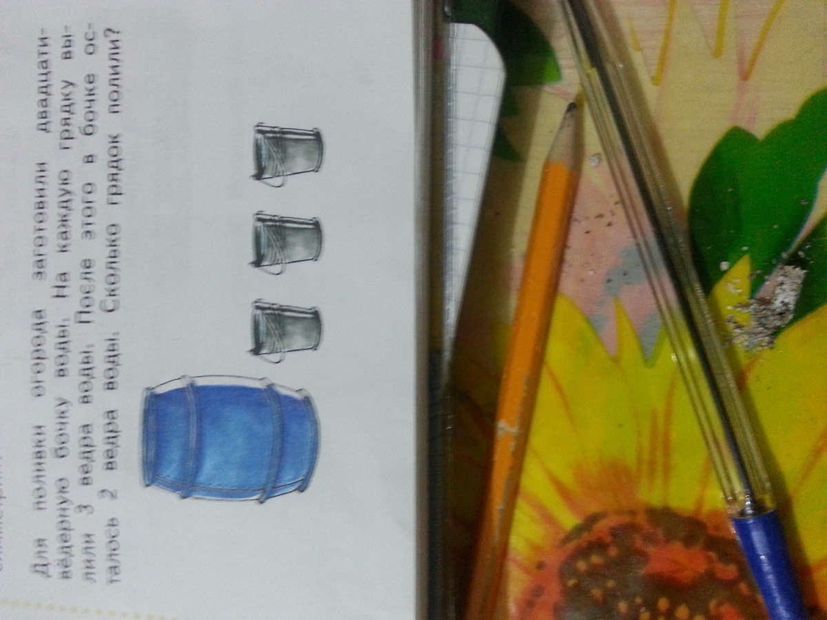 Сначала нужно ухнать сколько ведер потратили на полив грядок,т.е. 1 действие 20-2=18.Затем нужно узнать число грядок, которые полили,для этого нужно 18/3=6.Вот и все в принципе.