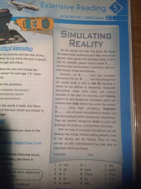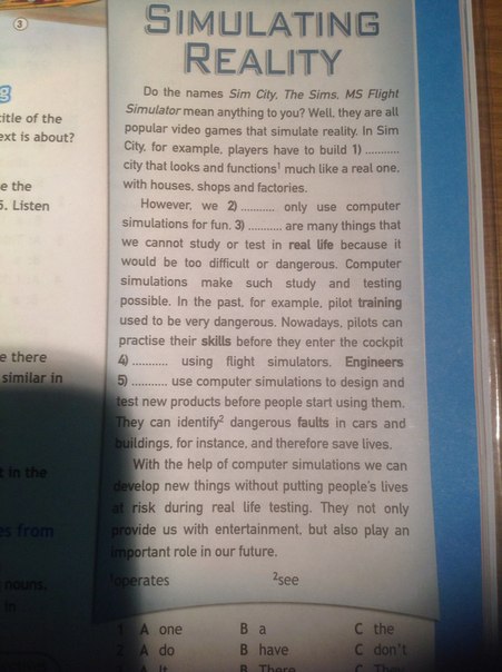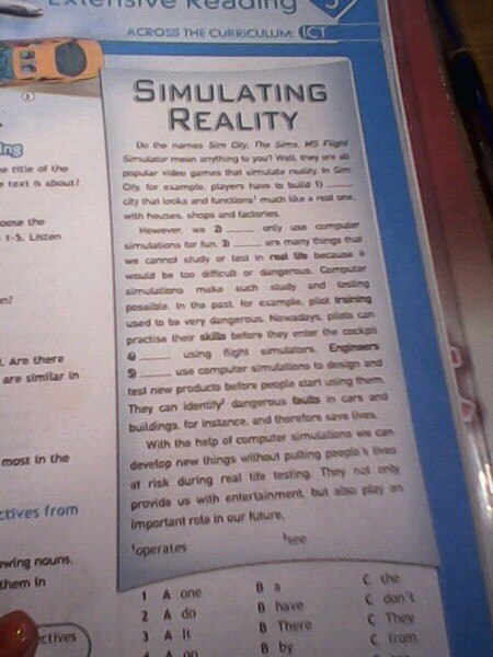 Мы играем в компьютерные симуляторы для развлечения. Многие вещи мы не можем проверить или протестировать в реальной жизни, потому что это сложно или даже опасно. Компьютерные симуляторы могут дать нам такие возможности. Например,в прошлом тренировки лётчиков были опасными. В наши же дни пилоты могут тренировать свои навыки в учебной машине-симуляторе. Они используют симуляторы полётов. Инженеры используют компьютерные симуляторы, чтобы протестировать новые продукты перед тем, как воплотить их в жизнь. Это помогает индентифицировать опасность в машинах и строениях.